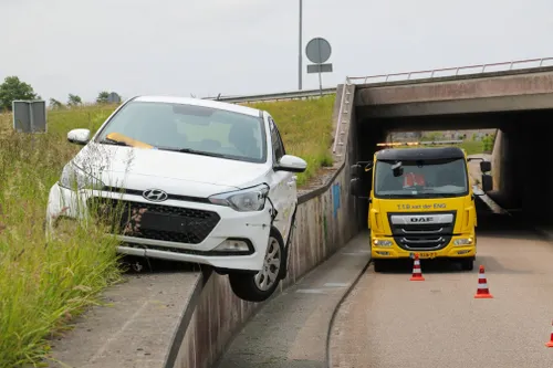 Na de botsing schoot het voertuig van de snelweg af en kwam