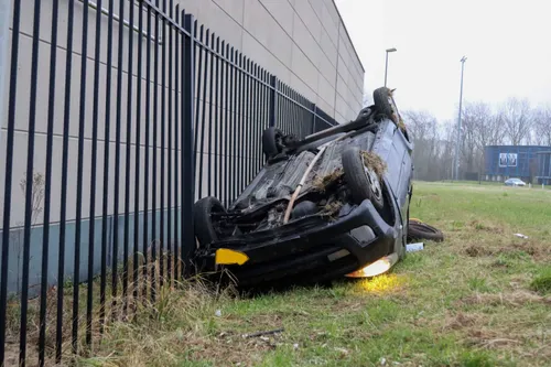 Concordiastraat in Velsen-Noord een auto op de kop tot stilstand gekomen, nadat
