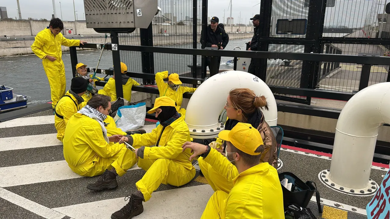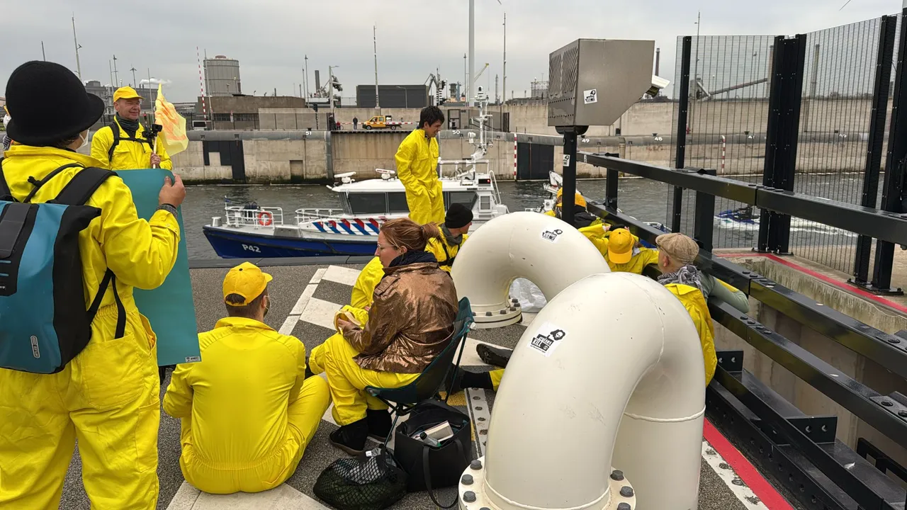 De actievoerders kwamen op de fiets en te voet in gele pakken aan bij de sluizen. Een groep van ongeveer zestig tegendemonstranten begroette de klimaatactivisten met luid boegeroep. De klimaatactivisten hebben XR-vlaggen bij zich en een spandoek met daarop in grote letters 'Maak schoon schip' en draaien muziek uit de film Titanic.