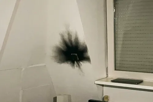 Binnen op de muur van het getroffen huis is een grote zwarte