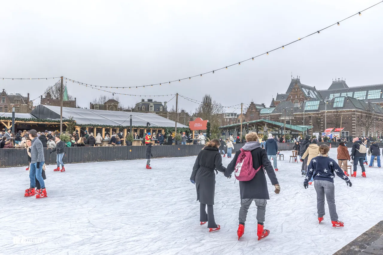 Naast de tulpentuin op het Museumplein konden schaatsliefhebbers een baantje trekken.....