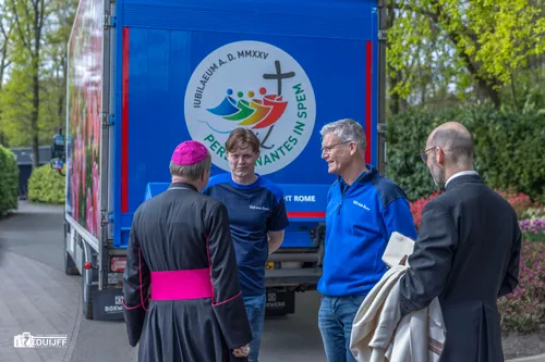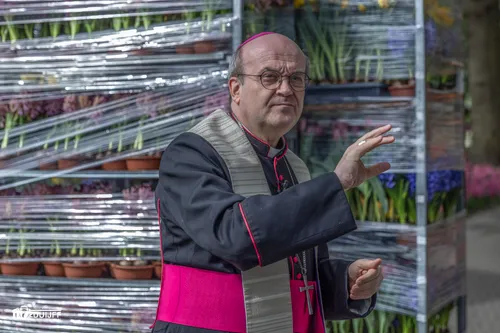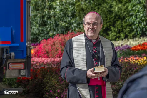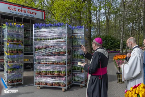 Voor het vertrek vanaf Keukenhof werden de bloemen eerst nog gezegend door de bisschop van Rotterdam en voorzitter van de Nederlandse bisschoppenconferentie, mgr. Hans van den Hende.