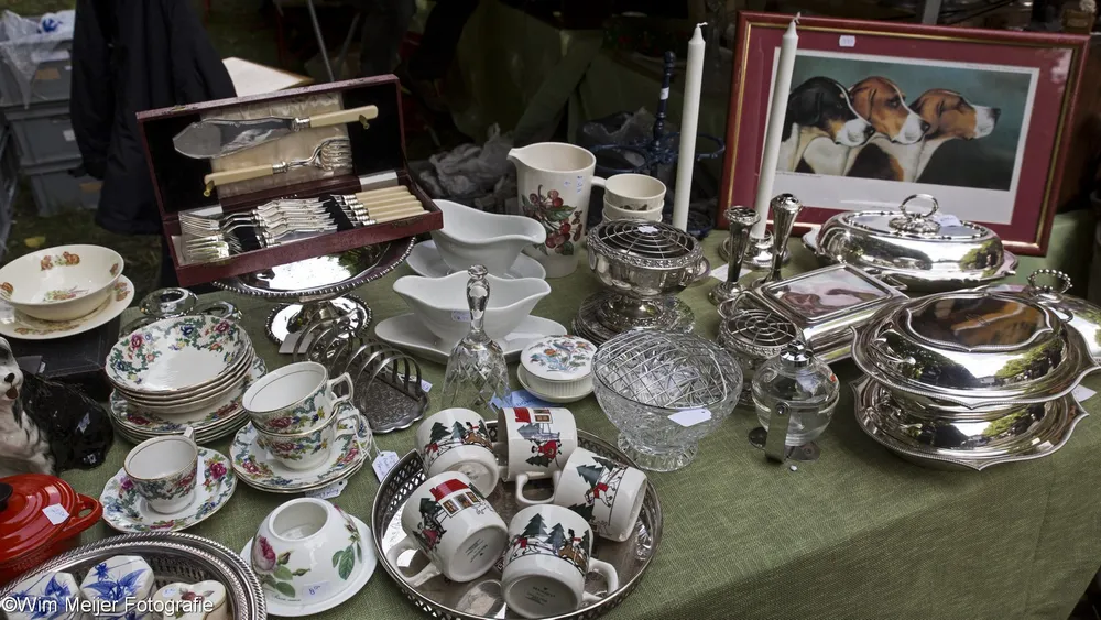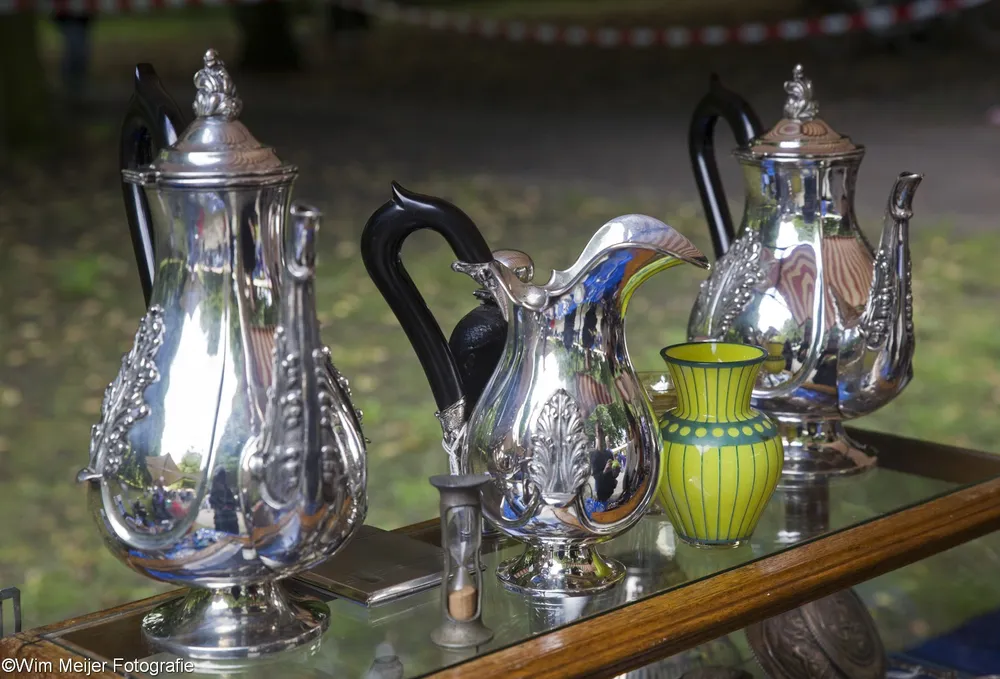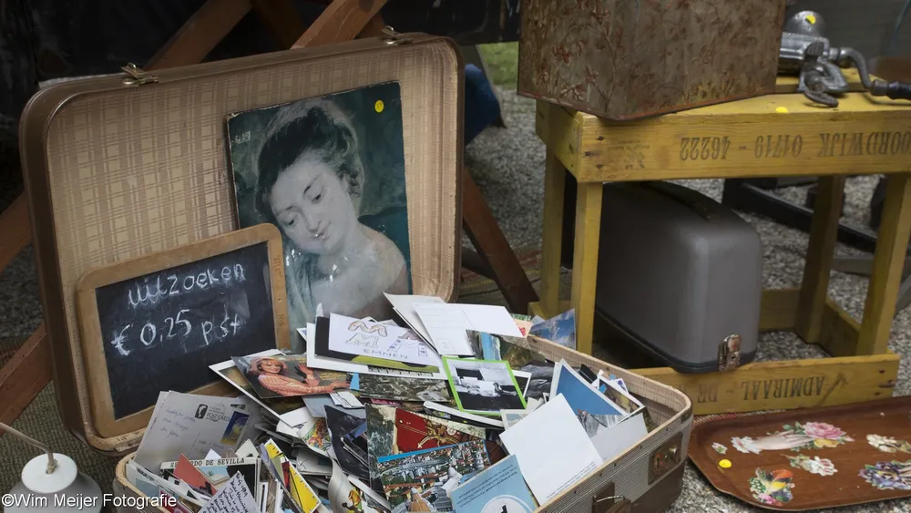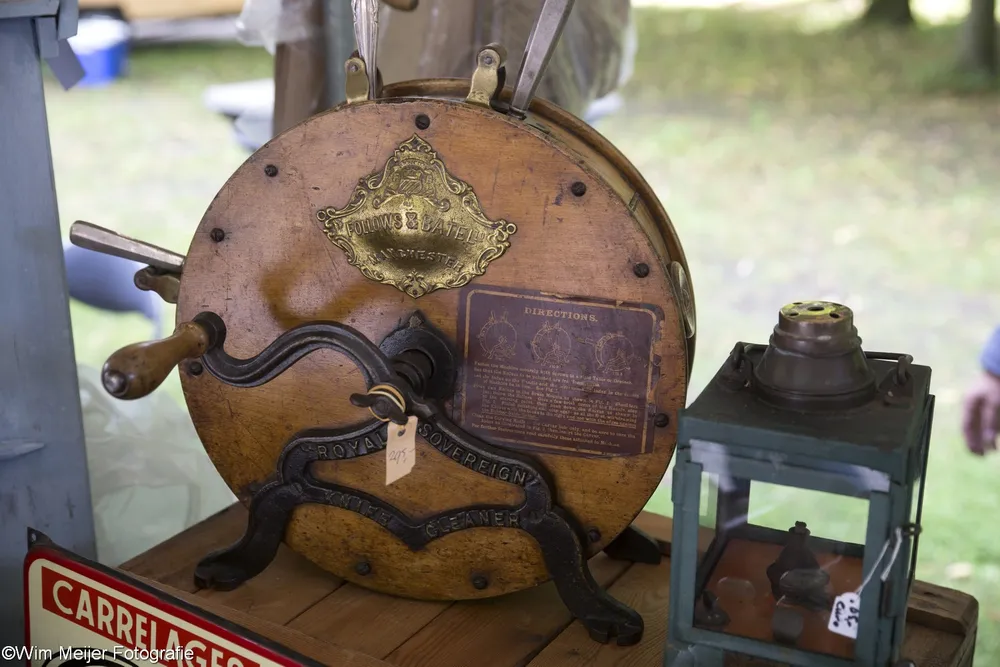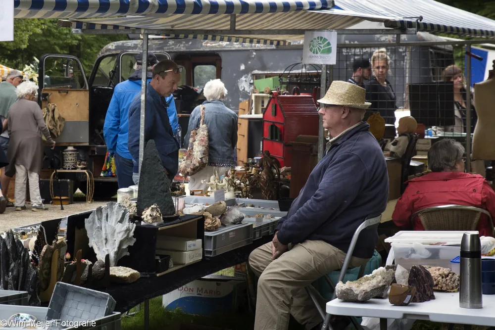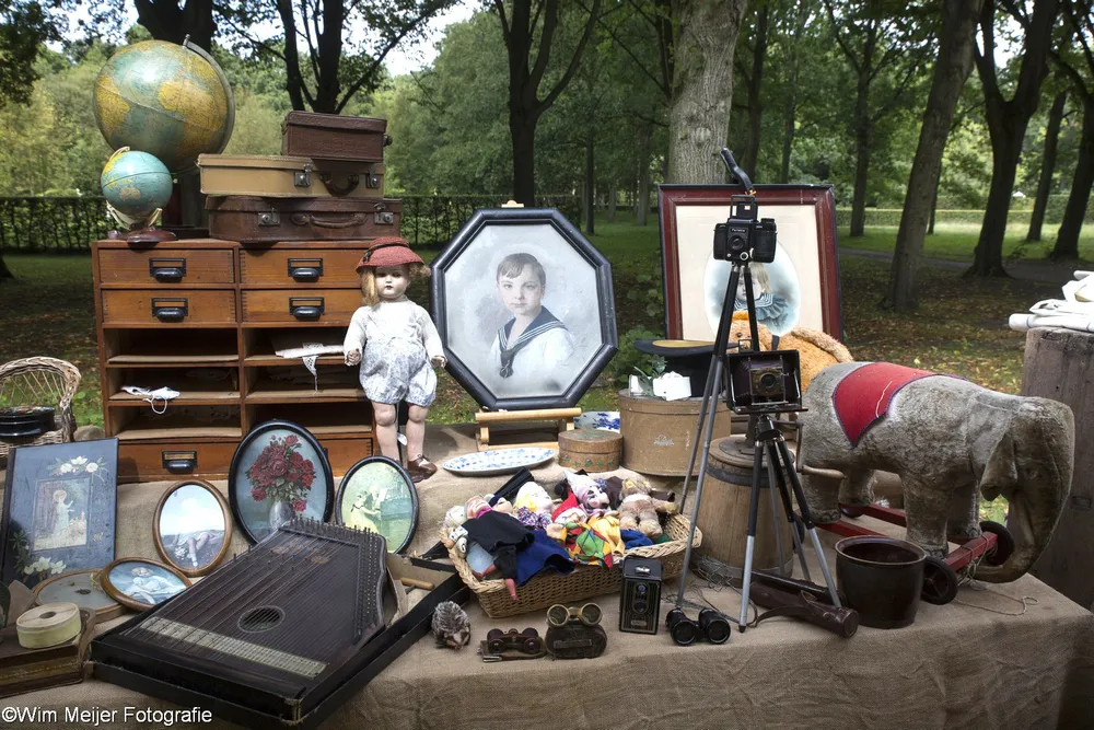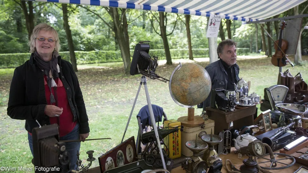 Terug naar landgoed Beeckestein, waar zondag 20 augustus rond de 150 kramen stonden opgesteld in de tuinen. Kramen met van alles wat bij de gemiddelde vijftigplusser diepe herinneringen oproept aan vroege jeugdjaren. Het emaille vergiet, de broodtrommel en de snijbonenmolen van moeder, ansichtkaarten die teruggaan tot ver voor de 2e wereldoorlog, kleding, theelepeltjes en fossielen. In de aanbieding het serviesgoed van grootma zaliger, nog in optimale staat omdat het nooit gebruikt mocht worden uit angst voor breuk. Maar ook de fotocamera uit 1918, een rasechte Kodak Brownie, een Follows & Bate messenreiniger daterend van het eind van de 19e eeuw en poppen met porseleinen koppen.