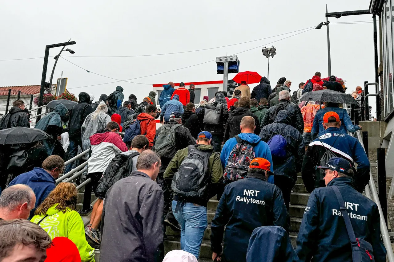 ZANDVOORT - De massale toestroom naar Zandvoort is weer op gang gekomen, en net zoals vorig jaar, toen de regen domineerde tijdens het iconische race-evenement, bepalen ook vanmorgen de poncho’s en paraplu's het beeld op Station Zandvoort, waar iedere 5 minuten een nieuwe volle trein met Verstappen-supporters binnenkomt.