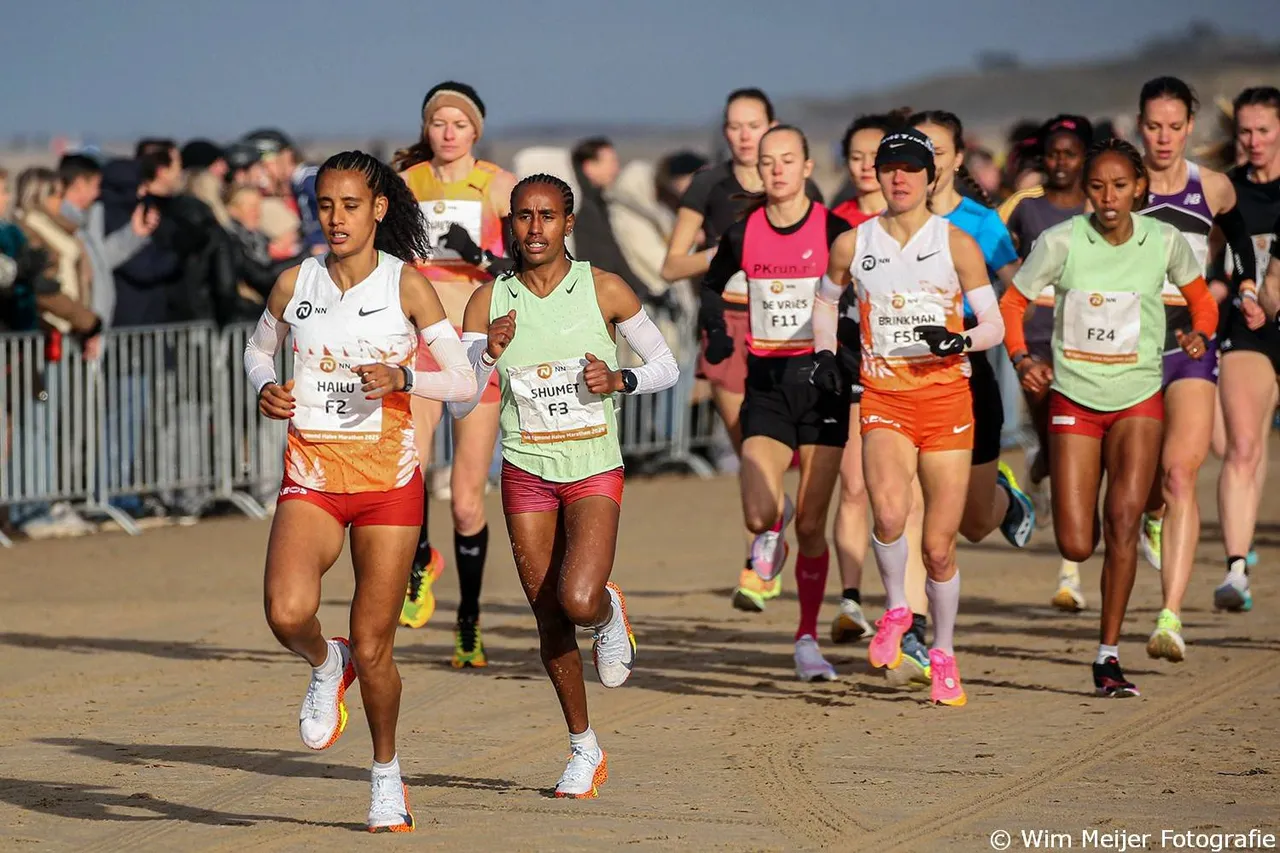 Drievoudig winnaar Ayele Abshero gaf om 12.16 uur het startschot voor de dames op de NN Egmond Halve Marathon, waar in totaal 18.500 hardlopers, aan meededen. Met op het strand een zeer gunstige wind in de rug was het duidelijk dat er snelle tijden in het verschiet lagen. Bij de vrouwen waren de Ethiopische dames Balemelay Shumet en oud-winnares Haven Hailu de initiatiefnemers, met in hun kielzog een terugkerende Nienke Brinkman en Ethiopische Adawork Aberta.