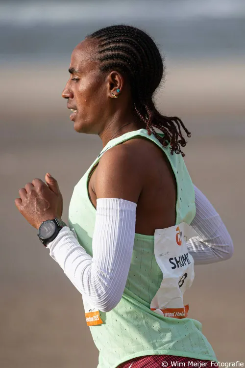 (weinig wind, hard strand en enkele graden boven nul) liep de Ethiopische Hailu